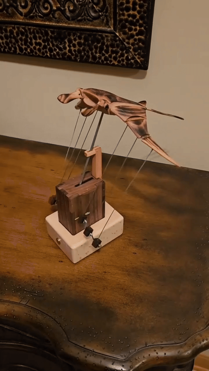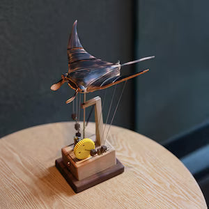La sculpture est composée de bois et de composants mécaniques de qualité, soigneusement assemblés pour garantir un mouvement fluide et durable.